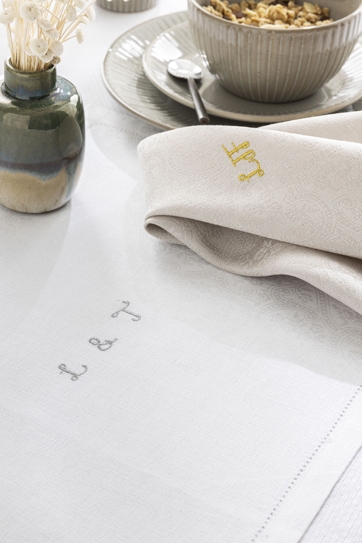 Um die Tradition der bestickten Haushaltswäsche fortzuführen, haben wir eine Stickereiwerkstatt in unsere Manufaktur in Gérardmer integriert. Unter den erfahrenen Händen unserer Stickerin werden Ihre Namen und Botschaften zum Leben erweckt und machen Ihre Haushaltswäsche zu einem Unikat.