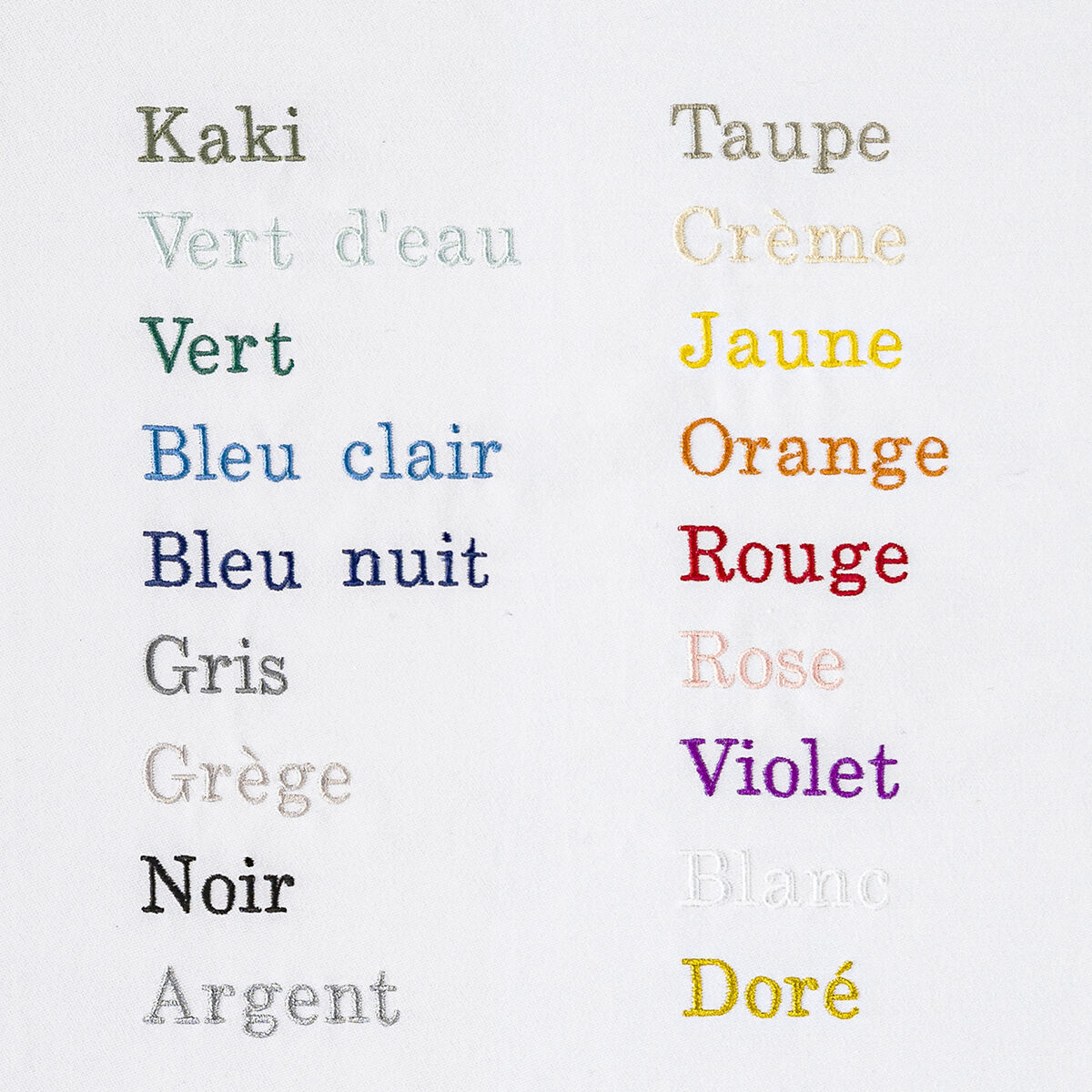 Um Ihre Artikel von Le Jacquard Français einzigartig zu machen, können Sie einen Vornamen oder eine kleine Botschaft mit bis zu 15 Zeichen sticken lassen. Sie haben die Wahl zwischen vier Schriftarten und 18 Farben!